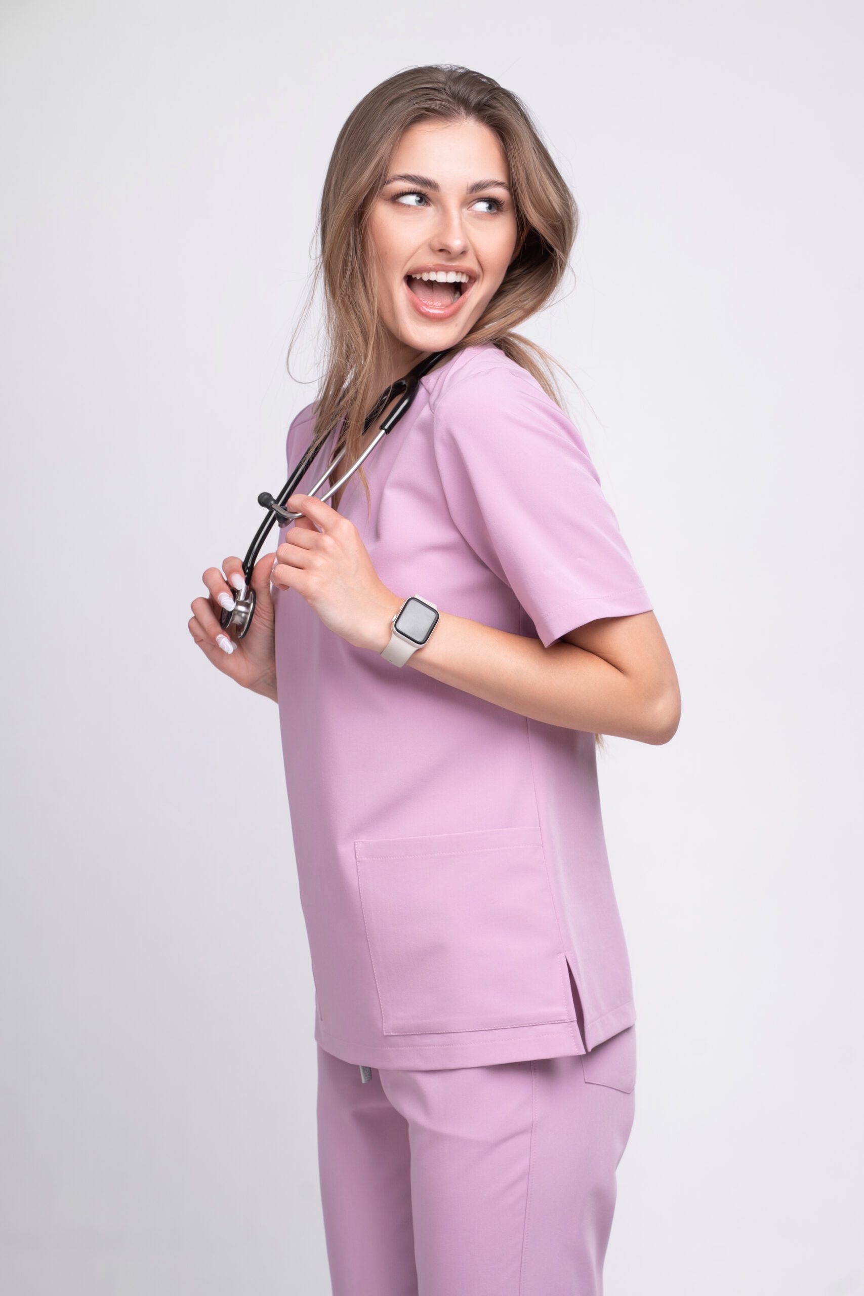 Bluza medyczna MILA z kolekcji Basic w kolorze Lilia Bloom łączy kobiecy styl i profesjonalny wygląd. Subtelny odcień różu wpisuje się w aktualne trendy i dodaje delikatności codziennemu uniformowi medycznemu. Fason z dekoltem w serek i dopasowany krój zapewniają wygodę oraz swobodę ruchów. Sylwetkę dodatkowo podkreśla elegancka linia cięcia. Bluza ma dwie pojemne kieszenie na wysokości bioder. Dzięki nim łatwo przechowasz potrzebne akcesoria w czasie pracy. Producent zastosował wysokiej jakości materiał techniczny. Tkanina jest lekka, oddychająca i odporna na zagniecenia, dlatego świetnie sprawdza się podczas intensywnego użytkowania w środowisku medycznym. To idealny wybór dla kobiet pracujących w zawodach medycznych, które chcą wyglądać stylowo i czuć się komfortowo przez cały dzień.