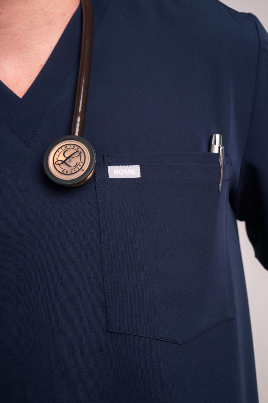 Bluza medyczna AXEL z kolekcji Basic w kolorze dark navy łączy styl, wygodę i funkcjonalność. Świetnie sprawdza się w każdym środowisku medycznym. Głęboki odcień granatu nadaje profesjonalnego charakteru, a nowoczesny krój z dekoltem w serek zapewnia komfort i swobodę ruchów przez cały dzień. Model wykonano z elastycznego i oddychającego materiału, który gwarantuje trwałość nawet podczas intensywnych dyżurów. Na piersi znajduje się praktyczna, pojemna kieszeń z wewnętrzną przegródką, dodatkowo przeszytą tak, by stworzyć osobne miejsce na długopis. Całość uzupełnia subtelna naszywka z logo NOSHI, podkreślająca jakość wykonania. Gładkie wykończenia i dopracowane detale nadają bluzie estetyczny i profesjonalny wygląd. AXEL idealnie komponuje się ze spodniami z tej samej kolekcji, tworząc wygodny i spójny uniform medyczny. To doskonały wybór dla lekarzy, pielęgniarek, fizjoterapeutów i ratowników, którzy cenią komfort oraz schludny wygląd każdego dnia.