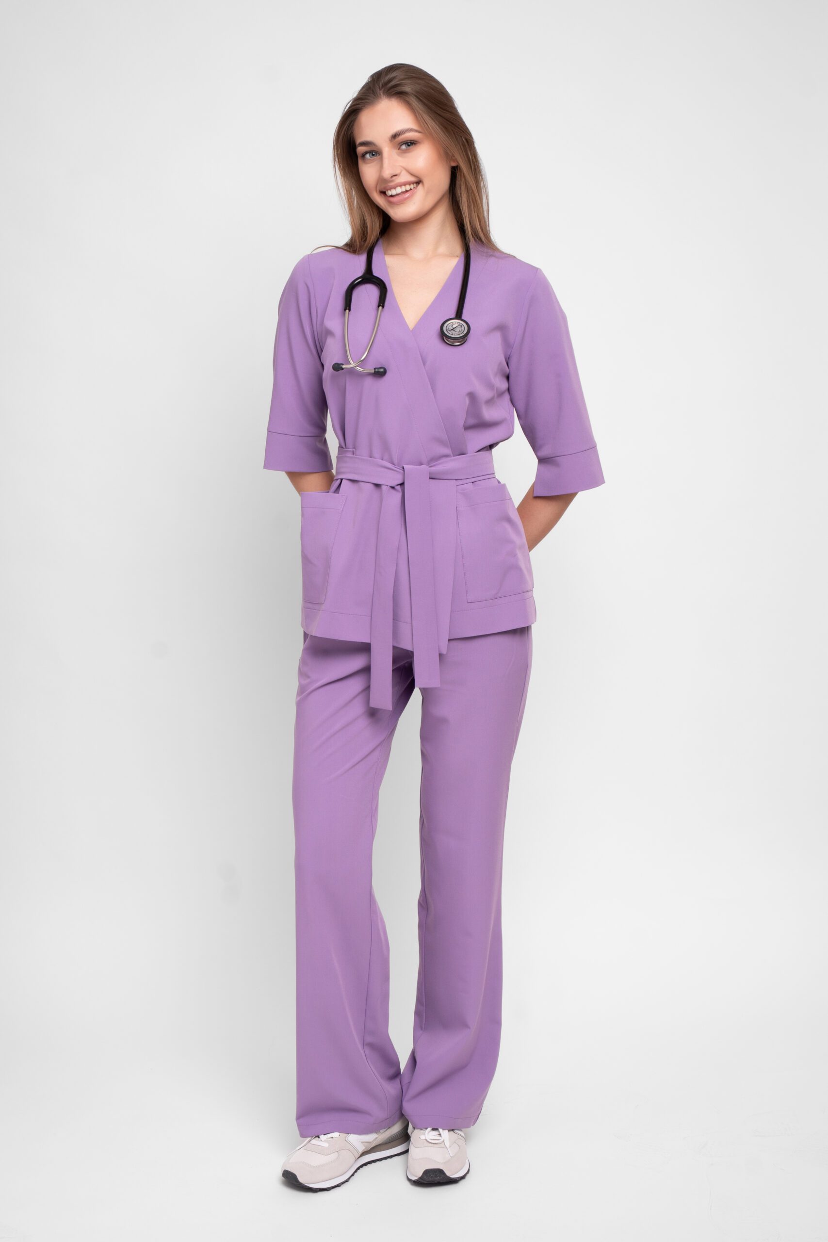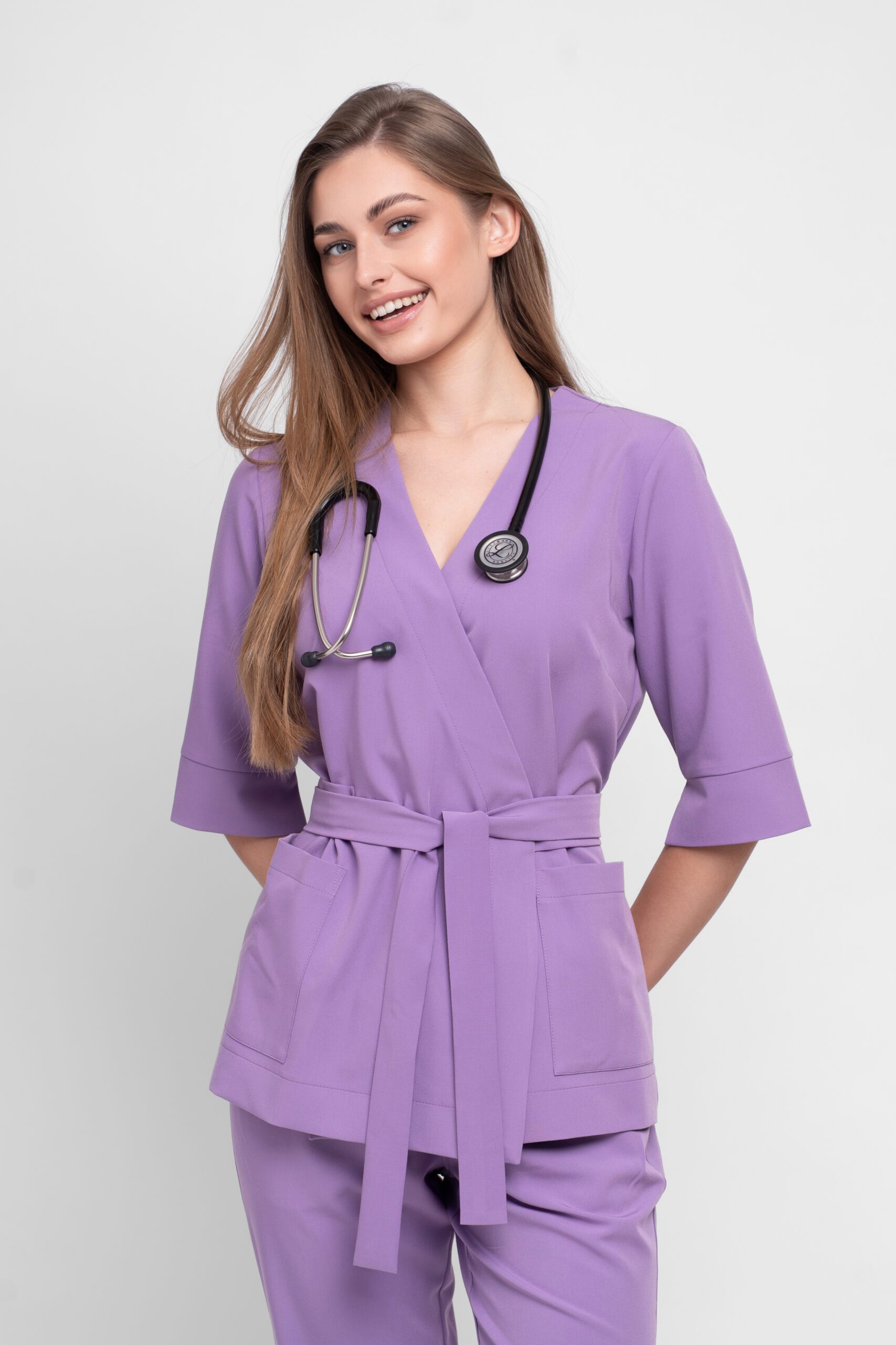 Bluza medyczna wiązana CALMA z kolekcji Basic – model kimono z wiązaniem w talii, kopertowy krój, dekolt V, rękaw ¾ z rozcięciem, 2 praktyczne kieszenie.