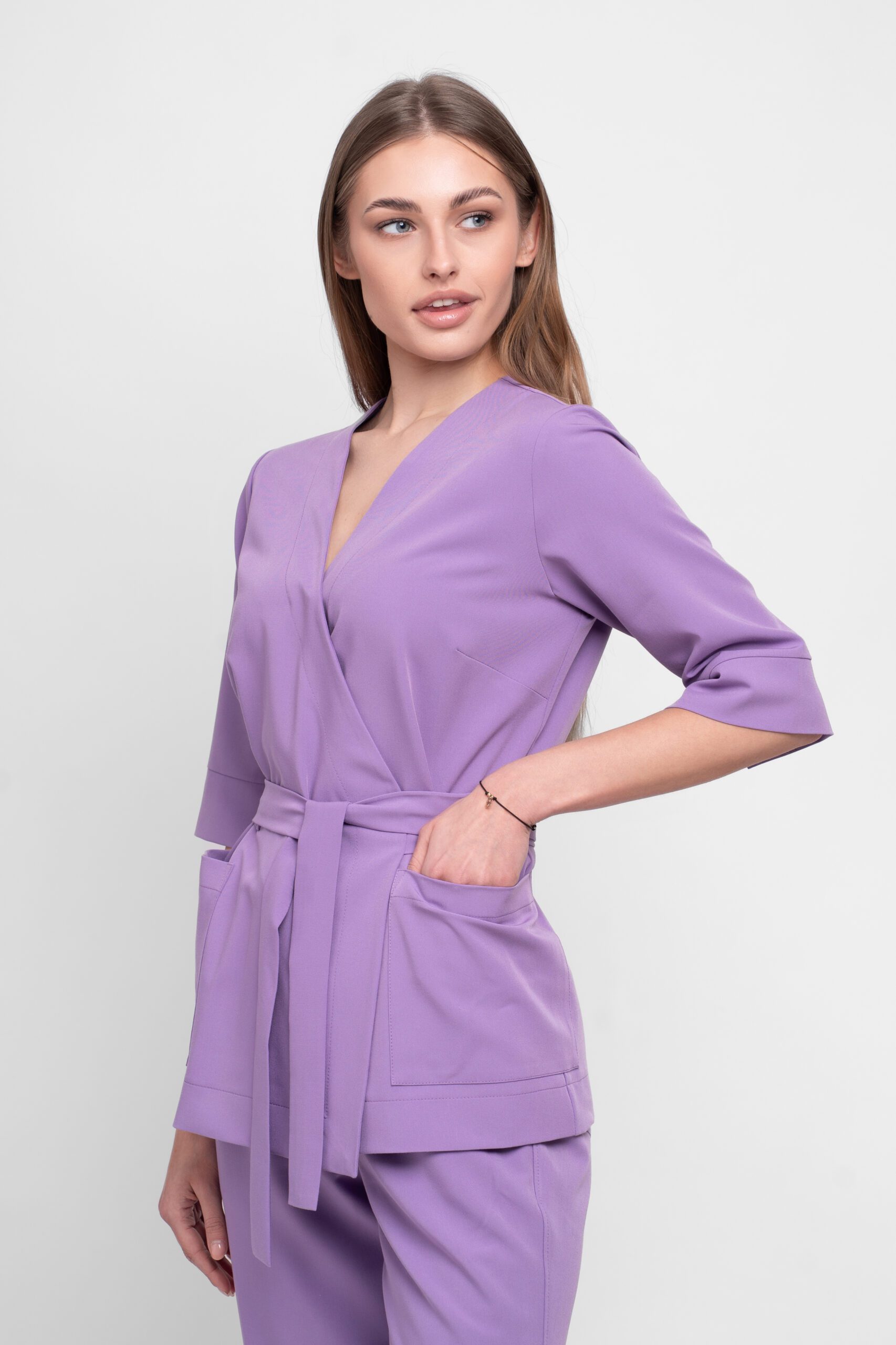 Bluza CALMA Basic Lavenda to lekki, kobiecy model o kopertowej konstrukcji, która umożliwia dopasowanie dzięki trzem sposobom wiązania. Profilowana linia ramion i delikatne taliowanie tworzą harmonijny, proporcjonalny kształt. Rękaw 3/4 zakończono subtelnym rozcięciem, które zwiększa zakres ruchu i nadaje elegancji. Kieszenie wszyto płasko, by zachować gładką linię przodu bez dodatkowej objętości. Tkanina Basic oferuje komfort, elastyczność i przewiewność – idealna na długie dni pracy.