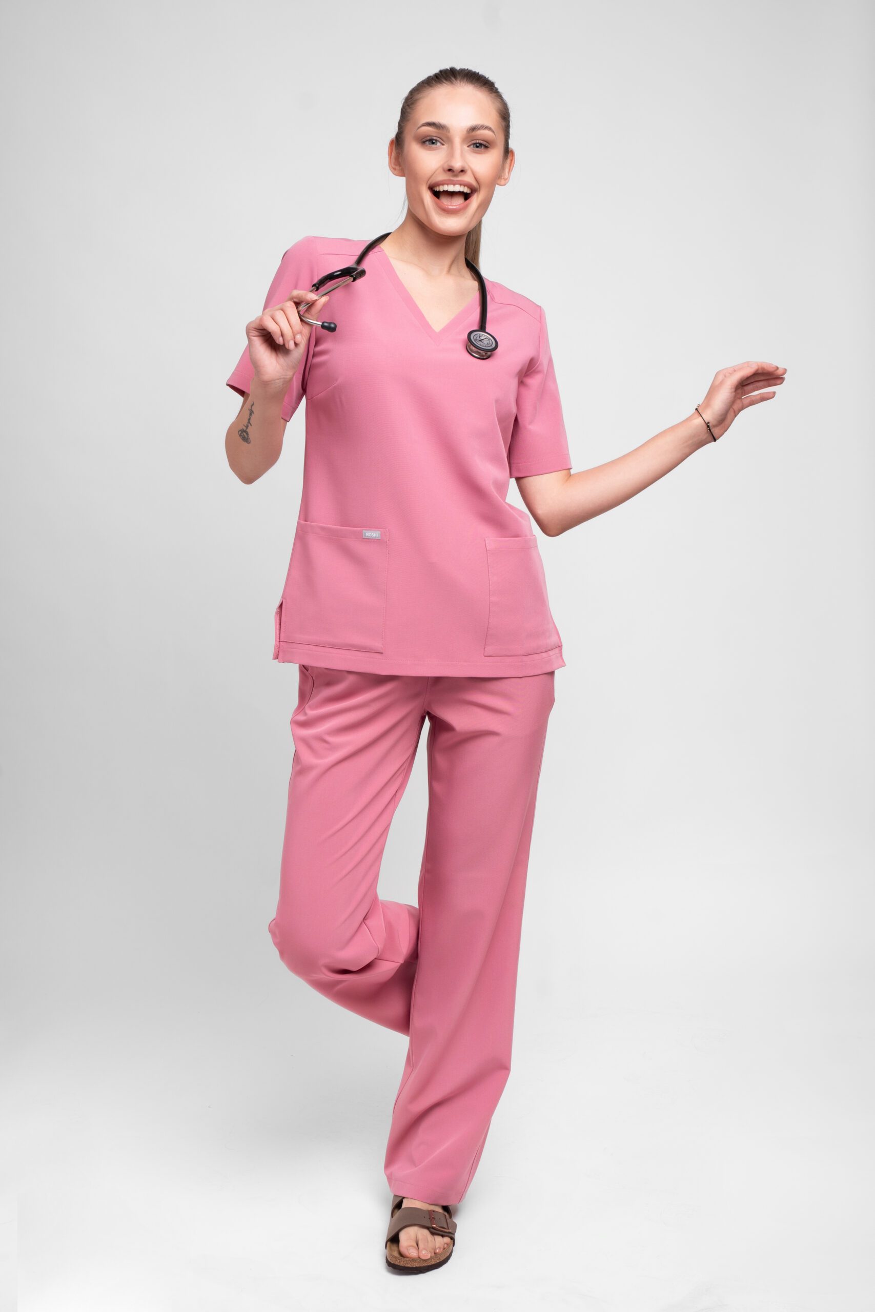 Spodnie medyczne COMFY Basic Ash Pink projektujemy z myślą o komforcie i estetyce. Prosta nogawka subtelnie układa się na sylwetce, dlatego zapewnia naturalny i lekki wygląd. Pas z regulowanym sznurkiem oraz elastyczną gumą pozwala łatwo dopasować spodnie do talii. Dzięki temu model gwarantuje wygodę przez cały dzień pracy. Spodnie posiadają cztery praktyczne i pojemne kieszenie, które ułatwiają przechowywanie niezbędnych akcesoriów. Jednocześnie krój pozostaje estetyczny i profesjonalny. Elastyczna tkanina Basic jest lekka oraz odporna na zagniecenia. Dlatego świetnie sprawdza się nawet podczas intensywnej pracy. Kolor Ash Pink to elegancki, stonowany róż, który dodaje uniformowi subtelnego charakteru.